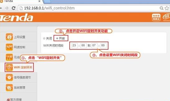 第二步:在路由器左侧菜单中点击“WIFI定时开关”,在打开的页面中进行相应设置,参考如下操作步骤: